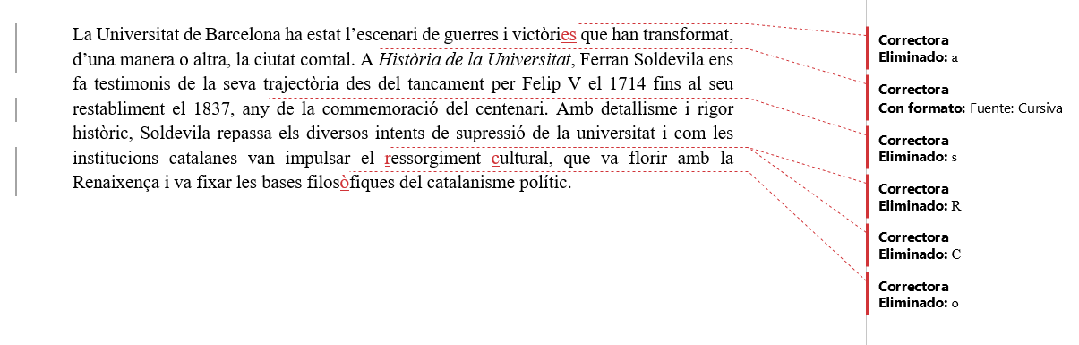 Cadascun d’aquests canvis queda registrat en el marge, i posteriorment l’autor pot acceptar o rebutjar els canvis segons vagi llegint.